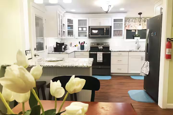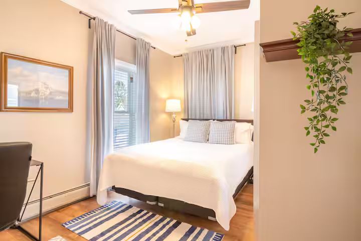 This is a 4 bedroom 2 full bath Home. The first floor Master Bedroom has en-suite tub shower combo and stacked Washer & Dryer. It has a 55 inch smart TV. It has an armoire for your clothes. The other three bed rooms are on the second floor. All bedrooms have each mini splits providing A/C and heat. Also has centralized heat as secondary source. The second floor bathroom features a walk in shower, double vanity sinks. Two of the bedrooms have queen mattresses and the 3rd bedroom has 2 twin beds- nicely appointed to delight your kids. All three bedrooms have built-in closets. One of the three bedrooms has a small office chair & table suited for remote working