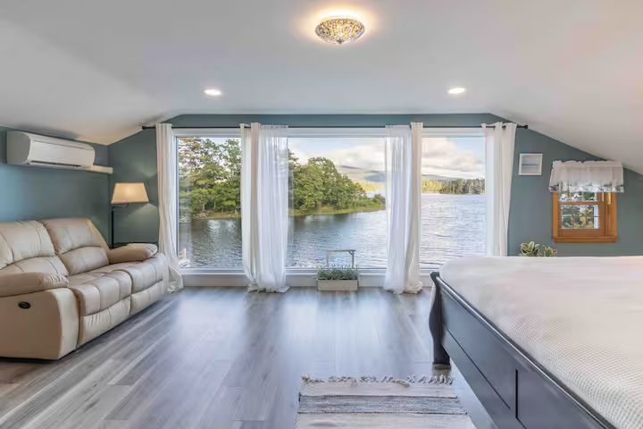 The Upper Level of this vacation home features two bedrooms. The master bedroom has an expansive picture window of the Somes. The Master Bedroom features king size bed, ensuite bath (walk in shower, vanity, toilet), smart tv, and comfortable power Leather Italia loveseat. The second bedroom has queen beds and an en-suite bath (walk in shower, vanity, toilet).